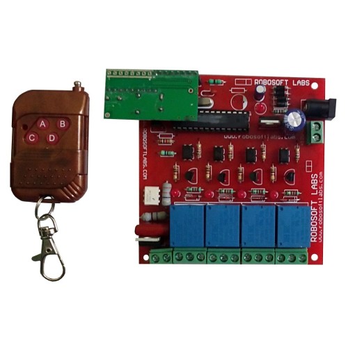 RF Remote control is a combination of RF Transmitter and Receiver which contains 4 Relays and 1 TRiAC output which can be controlled wirelessly. This makes the unit very easy to operate and integrate with existing systems. The remote control operates the corresponding relay on the receiver board, i.e. (Light 1 operates relay 1), (Light 2 operates relay 2), etc. Relay contact can control any equipment in Latch Mode (Toggle on each key press). Each relay has indicator LED showing the ON/OFF status.